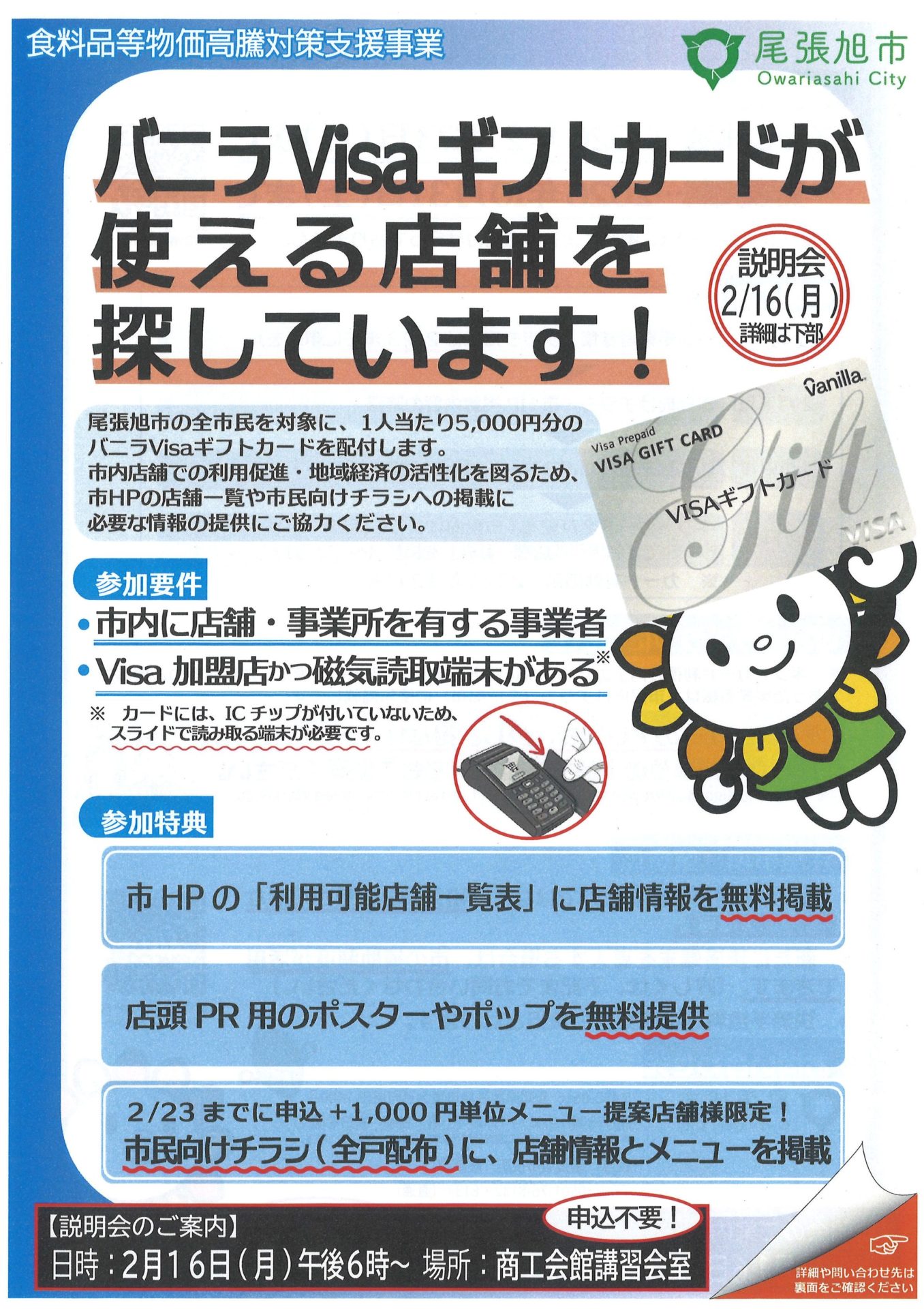 尾張旭市食品等物価高騰対策支援事業バニラVisaギフトカードが使える店舗を募集しています!